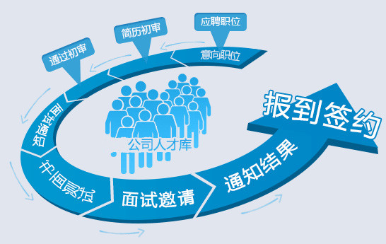 招聘流程:選定意向職位→應(yīng)聘職位→簡(jiǎn)歷初審→通過(guò)初審→面試通知→測(cè)試→面試測(cè)評(píng)→通知面試結(jié)果→報(bào)到簽約