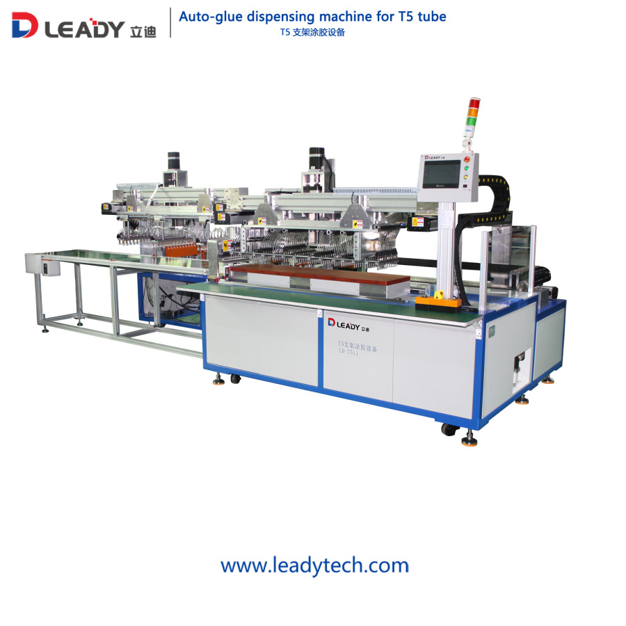 ? Leady has developed a kind of intelligent automatic LED lamp tube auto-glue dispensing equipment, which includes auto-loading structure, lamp tubes transmission structure, lamp tube suck up structure, cutting soft PCB board structure, go through tube structure,? auto-unloading structure and so on. The auto-loading structure has the conveying belt which can realize the automatic loading the tubes. The cutting soft PCB board structure can separate the whole FPC, and then the FPC will be sucked to the carbon fiber rob by the sucker through the vacuum. After that the carbon fiber robs will go through the tube and multi-glue valve will dispensing the glue on the FPC at the same time to finish the whole production process. The semi-finished products will be turned over 180 degrees before automatic unloading. Not only the machine can help to the factories to improve the working efficiency, but also it can help to decrease the labor intensity obviously.